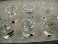 Nemsokára kiterülnek a levelek. A nyakas üvegek szájánál a levélszár esetenként nem jut át, hanem megy körbe, a műanyag pohárnál ez nem okoz gondot. A penészedés már csak egy-egy magnál látható.